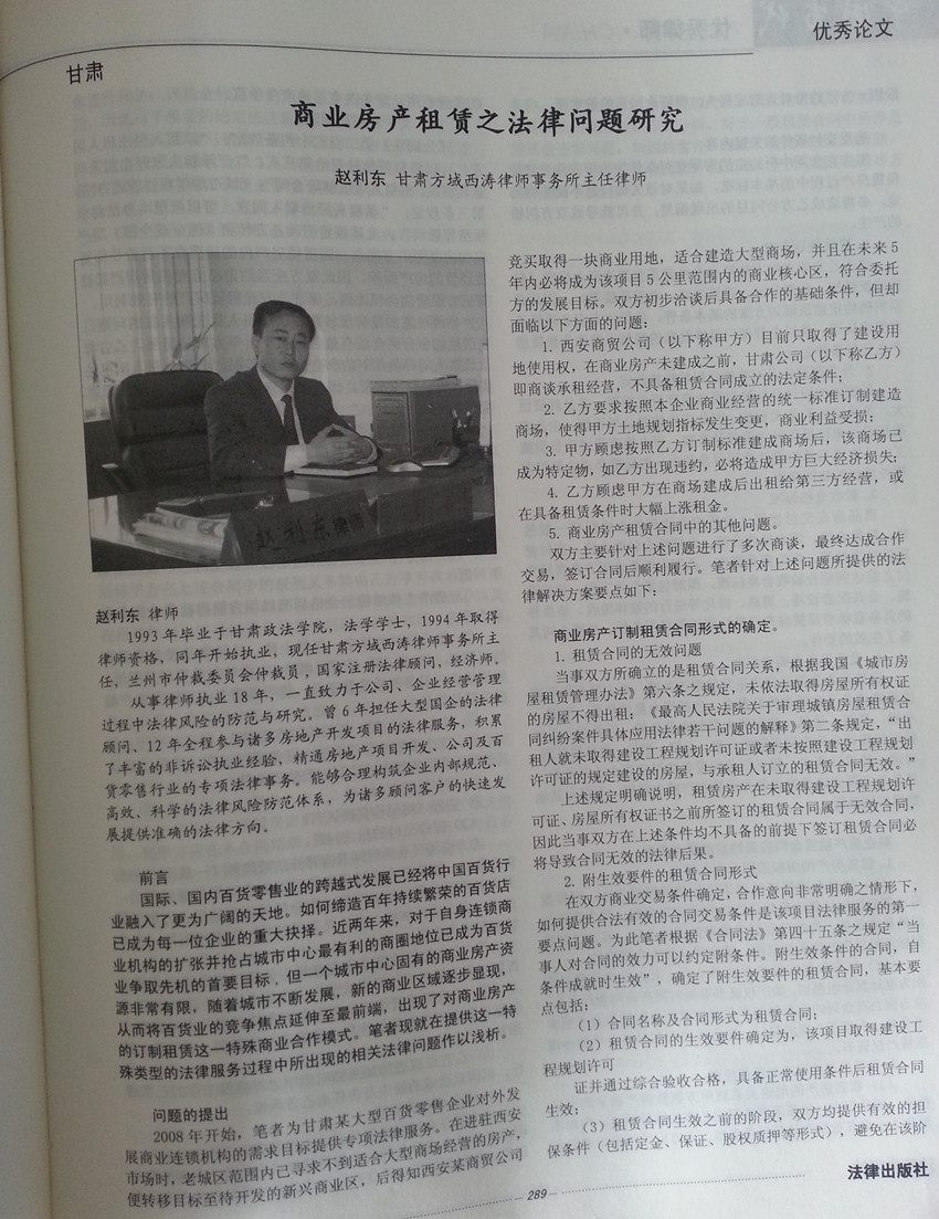 我所赵利东主任的论文《商业房产租赁之法律问题研究》入选《中国当代优秀律师》系列丛书。《中国当代优秀律师》由法律出版社出版,由当代法学泰斗江平教授题写总序言,为中国当代律师系列丛书第一卷。本书收录了从全国几十万名律师中精选出的经典案例、优秀论文,我所赵利东主任为甘肃省唯一入选该书的优秀律师。
